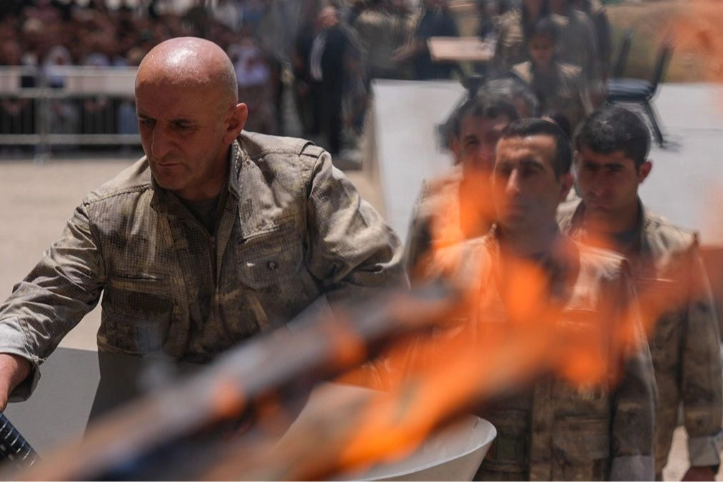 Öcalan’ın çağrısı doğrultusunda örgüt, 11 Temmuz 2025’te Irak Kürt Bölgesel Yönetimi sınırları içindeki Süleymaniye kırsalında bir “silah bırakma töreni” düzenledi.