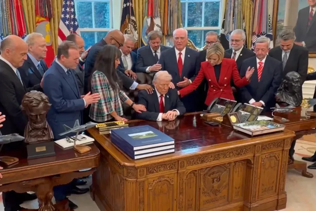 Sosyal medyada paylaşılan videoda, Trump’ın masasında gözlerini yumarak oturduğu, Evangelist din insanları ise ona dokunarak dua ettiği görülüyor.