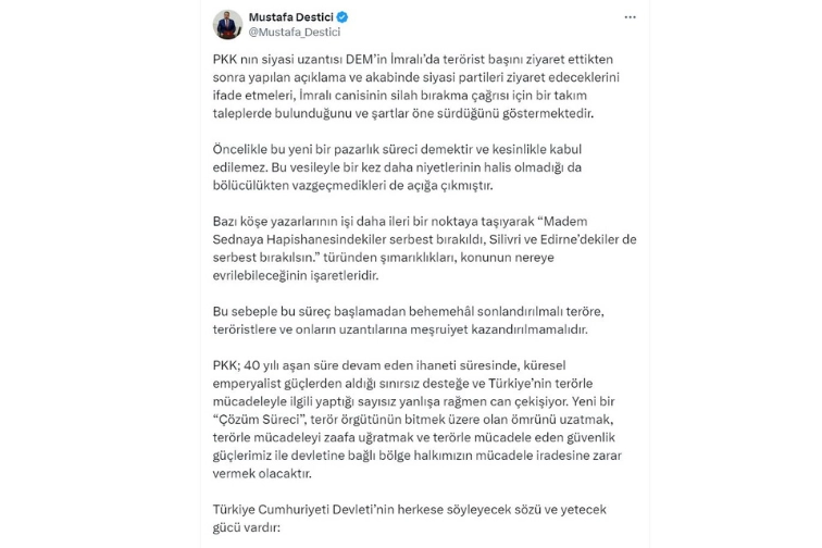 BBP Lideri Destici, sosyal medya hesabından açıklama yaptı. Destici, "PKK'nın siyasi uzantısı DEM'in İmralı'da teröristbaşını ziyaret ettikten sonra yapılan açıklama ve akabinde siyasi partileri ziyaret edeceklerini ifade etmeleri, İmralı canisinin silah bırakma çağrısı için bir takım taleplerde bulunduğunu ve şartlar öne sürdüğünü göstermektedir. Öncelikle bu yeni bir pazarlık süreci demektir ve kesinlikle kabul edilemez. Bu vesileyle bir kez daha niyetlerinin halis olmadığı da bölücülükten vazgeçmedikleri de açığa çıkmıştır. Bazı köşe yazarlarının işi daha ileri bir noktaya taşıyarak 'Madem Sednaya Hapishanesindekiler serbest bırakıldı, Silivri ve Edirne'dekiler de serbest bırakılsın' türünden şımarıklıkları, konunun nereye evrilebileceğinin işaretleridir. Bu sebeple bu süreç başlamadan behemehal sonlandırılmalı teröre, teröristlere ve onların uzantılarına meşruiyet kazandırılmamalıdır" ifadelerini kullandı.