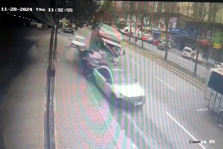 Kaza anı, bir işyerinin güvenlik kamerasına saniye saniye yansıdı. Güvenlik kamerasına yansıyan görüntülerde bir midibüsün arkasından caddede ilerleyen kamyonetin, park halinde bulunan araçlara çarptığı anlar görülüyor.