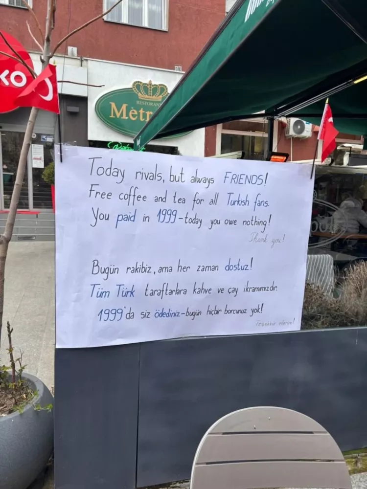 Kosova'nın başkenti Priştine'de bir işletme, astığı pankartla iki ülke arasındaki tarihi bağı bir kez daha gözler önüne serdi. 1999 yılındaki savaşta Türkiye'nin sağladığı desteği unutmayan kafe sahibi, "Bugün rakibiz ama her zaman dostuz. Tüm Türk taraftarlara kahve ve çay ikramımızdır. 1999'da siz ödediniz, bugün hiçbir borcunuz yok" dedi.