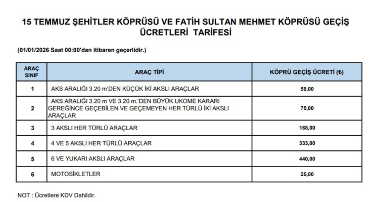 1 Ocak 2026'dan itibaren geçerli olacak köprü ve otoyol ücretleri açıklandı. Buna göre otomobiller için; 15 Temmuz ve Fatih Sultan Mehmet Köprüsü tek yön ücreti 59; Yavuz Sultan Selim Köprüsü 100 ; Osmangazi Köprüsü ve Çanakkale 1915 Köprüsü 998; Avrasya Tüneli ise 228 Türk Lirası oldu.