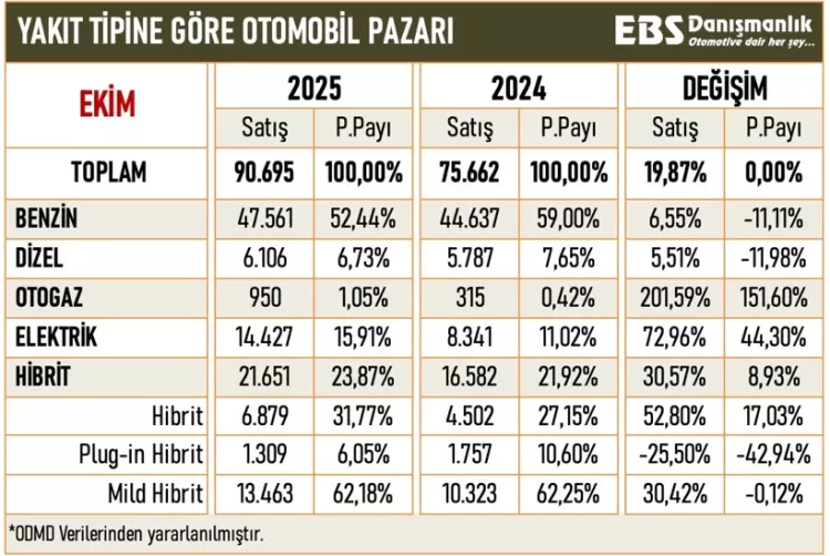 Otomobil pazarında yakıt tipine göre dağılım dengesi Ekim ayında köklü bir değişim yaşadı. ODMD verilerine göre, tamamen elektrikli araç (EV) satışları geçen yıla göre yüzde 72,96 sıçrayarak 14.427 adede ulaştı ve pazar payı yüzde 15,91'e yükseldi. Hibrit araçlar pazar payını çıkararak bu dönüşümün kalıcı olduğunu gösterdi. Buna karşın, benzinli ve dizel araçların payı da yüzde 7,65'ten yüzde 6,73'e geriledi.