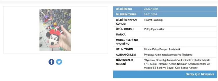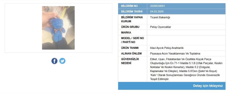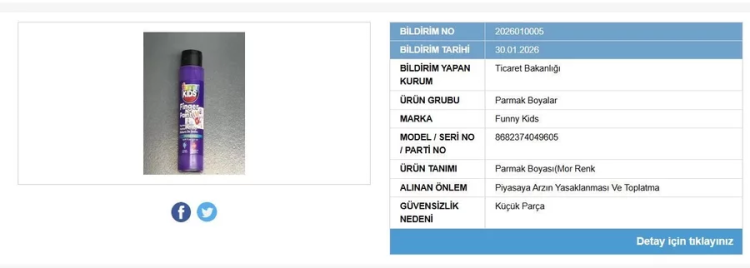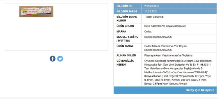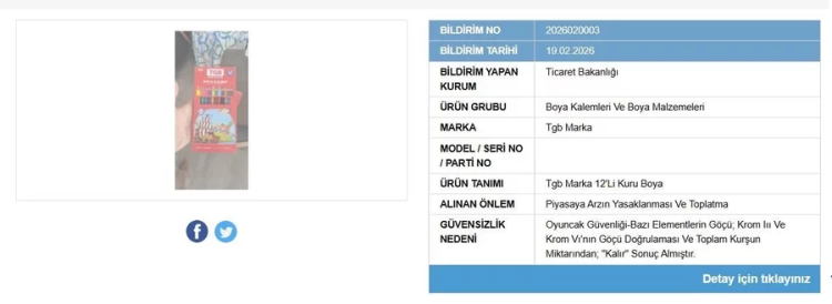 Ticaret Bakanlığı tarafından yürütülen denetim çalışmaları kapsamında Güvensiz Ürün Bilgi Sistemi (GÜBİS) üzerinden yapılan açıklamada bir ürünün kullanıcı sağlığı açısından risk taşıdığı belirtildi.