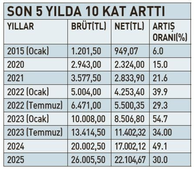 Şu anda bir işçi için aylık brüt 26.005,50 TL, kesintiler sonrası net 22.104,67 TL olarak uygulanıyor. Türkiye genelinde 7 milyondan fazla çalışan doğrudan asgari ücret üzerinden maaş alıyor. Asgari ücret yalnızca çalışanları değil, işverenleri, kamu sözleşmelerini ve sosyal destek mekanizmalarını da yakından ilgilendiriyor.