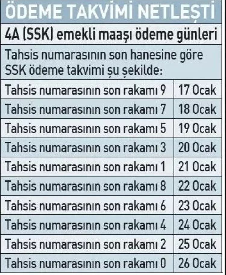 Tüm aylıklar 17-26 Ocak tarihleri arasında yatacak. Bağ-Kur emeklilerinin aylıkları ise 25-28 Ocak tarihleri arasında hesaplarda olacak. Memur emeklileri ise doğum tarihlerine göre ayın 1-5 tarihleri arasında aylıklarını alıyor.