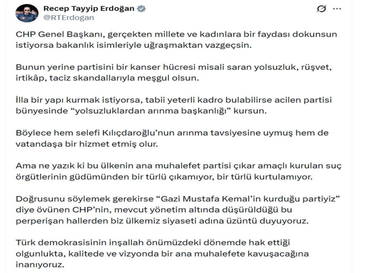Cumhurbaşkanı Erdoğan, sanal medya hesabından yaptığı açıklamada, "CHP Genel Başkanı, gerçekten millete ve kadınlara bir faydası dokunsun istiyorsa, bakanlık isimleriyle uğraşmaktan vazgeçsin. Bunun yerine partisini bir kanser hücresi misali saran yolsuzluk, rüşvet, irtikap, taciz skandallarıyla meşgul olsun. İlla bir yapı kurmak istiyorsa, tabii yeterli kadro bulabilirse acilen partisi bünyesinde 'yolsuzluklardan arınma başkanlığı' kursun. Böylece hem selefi Kılıçdaroğlu'nun arınma tavsiyesine uymuş hem de vatandaşa bir hizmet etmiş olur. Ama ne yazık ki bu ülkenin ana muhalefet partisi çıkar amaçlı kurulan suç örgütlerinin güdümünden bir türlü çıkamıyor, bir türlü kurtulamıyor. Doğrusunu söylemek gerekirse 'Gazi Mustafa Kemal'in kurduğu partiyiz' diye övünen CHP'nin mevcut yönetim altında düşürüldüğü bu perperişan hallerden biz ülkemiz siyaseti adına üzüntü duyuyoruz. Türk demokrasisinin inşallah önümüzdeki dönemde hak ettiği olgunlukta, kalitede ve vizyonda bir ana muhalefete kavuşacağına inanıyoruz" ifadelerini kullandı.
