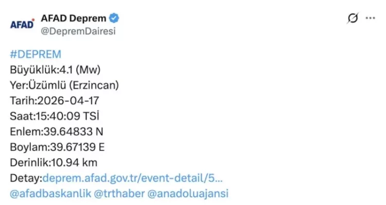 Erzincan'ın Üzümlü ilçesinde saat 15.40'da 4.1 büyüklüğünde deprem meydana geldi.