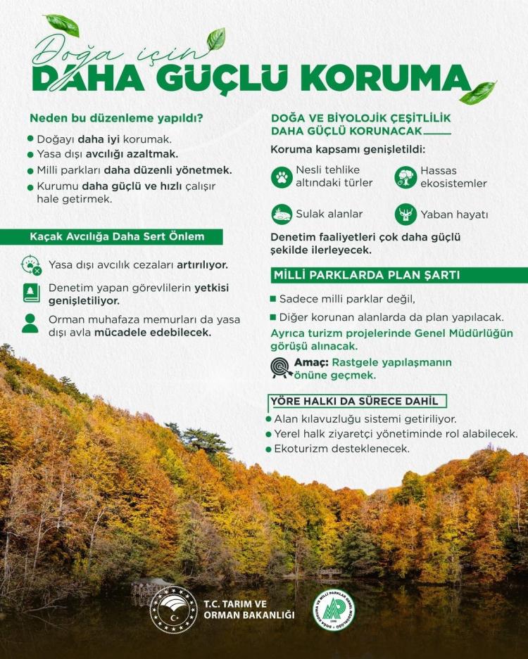 Milli Parklar Kanunu ile yaban hayatından biyolojik çeşitliliğimize, ekosistemimizden korunan alanlarımıza kadar doğamız için daha güçlü bir koruma kalkanı oluşturuyor; bizlere emanet edilen bu eşsiz mirası yarınlarımıza güvenle taşıyoruz.