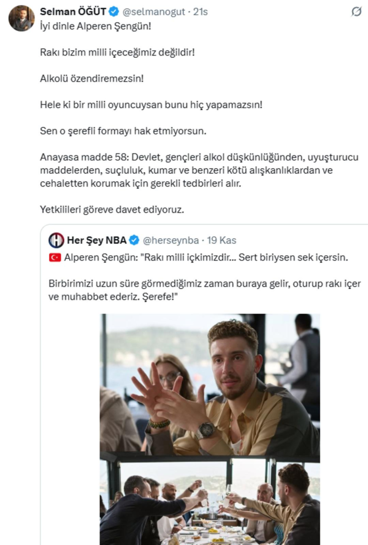 NBA'de Houston Rockets forması giyen A Milli yıldız basketbolcusu Alperen Şengün "Rakı milli içkimizdir" diyen açıklamasına Selman Öğüt, "Rakı bizim milli içeceğimiz değildir! Yetkilileri göreve davet ediyoruz" diyerek bir paylaşım yaptı. Öğüt'ün söz konusu paylaşımı sosyal medyada tepki çekti. Vatandaşlar Şengün'e sahip çıkarken Öğüt'e tepki gösterdi. Bir vatandaş "Alperen'in formasındaki ter damlası kadar faydan yok" dedi.