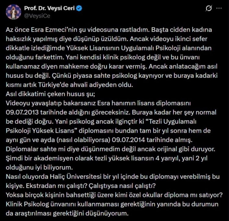 Prof. Dr. Veysi Ceri, Ezmeci'nin paylaşımını yayınlayarak ''Az önce Esra Ezmeci’nin şu videosuna rastladım. Başta cidden kadına haksızlık yapılmış diye düşünüp üzüldüm. Ancak videoyu ikinci sefer dikkatle izlediğimde Yüksek Lisansının Uygulamalı Psikoloji alanından olduğunu farkettim. Yani kendisi klinik psikolog değil ve bu ünvanı kullanamaz diyen mahkeme doğru karar vermiş. Ancak anlatacağım asıl husus bu değil. Çünkü piyasa sahte psikolog kaynıyor ve buraya kadarki kısmı artık Türkiye’de ahvali adiyeden oldu.
