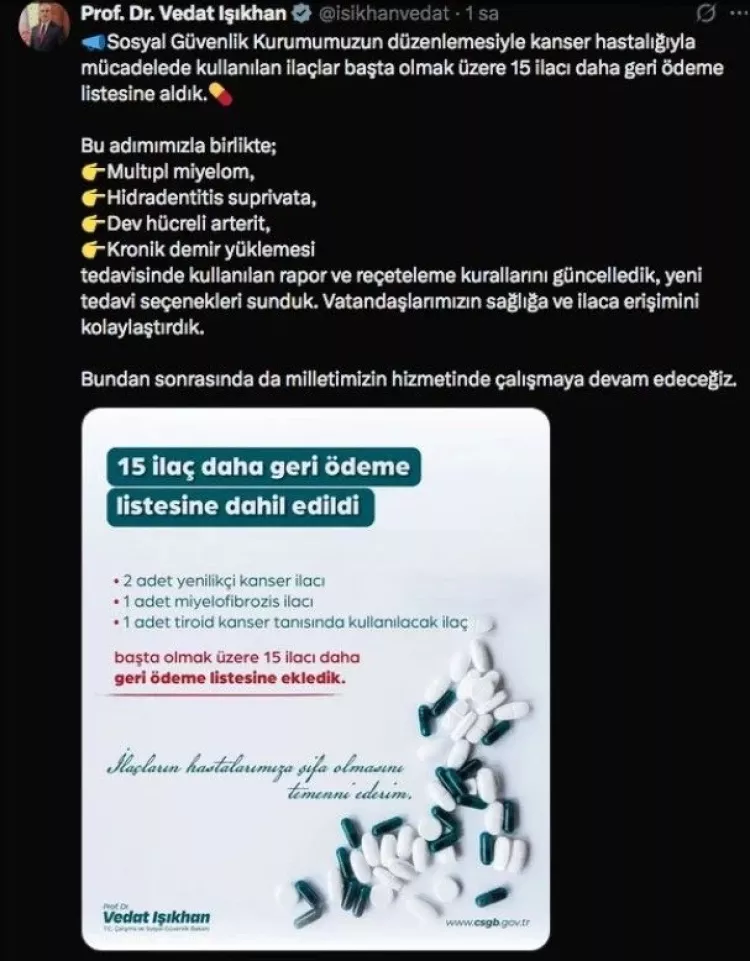 Kanser hastalığıyla mücadelede kullanılan ilaçlar başta olmak üzere 15 ilaç SGK tarafından geri ödeme listesine alındı. Sıcak gelişmeyi Çalışma ve Sosyal Güvenlik Bakanı Vedat Işıkhan, sosyal medya hesabından paylaştı.