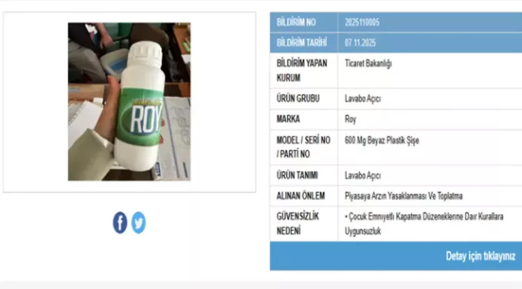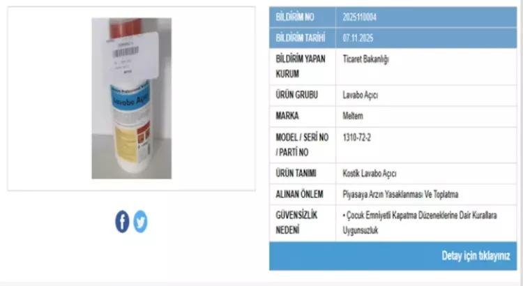 Ticaret Bakanlığı tarafından yapılan açıklamada Roy Marka lavabo açıcı ile Meltem marka kostik lavabo açıcılar hakkında “Piyasaya arzın yasaklanması ve toplatılması” şeklinde önlem alındığı belirtildi. Güvensizlik nedeni ise “Çocuk emniyetli kapatma düzeneklerine dair kurallara uygunsuzluk” olarak belirtildi.