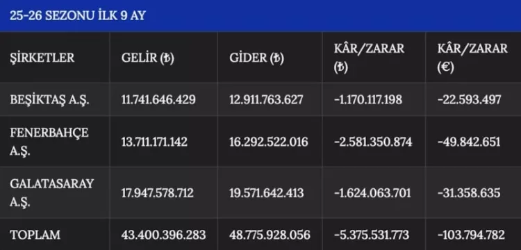 Yaklaşık 43,4 milyar liralık gelire ulaşan kulüplerin giderleri 48,8 milyar liraya yaklaştı. Böylece üç büyükler, bu sezonun 1 Haziran 2025 -28 Şubat 2026 arasını kapsayan ilk 9 ayını, 5 milyar 375 milyon liralık zararla kapattı.
