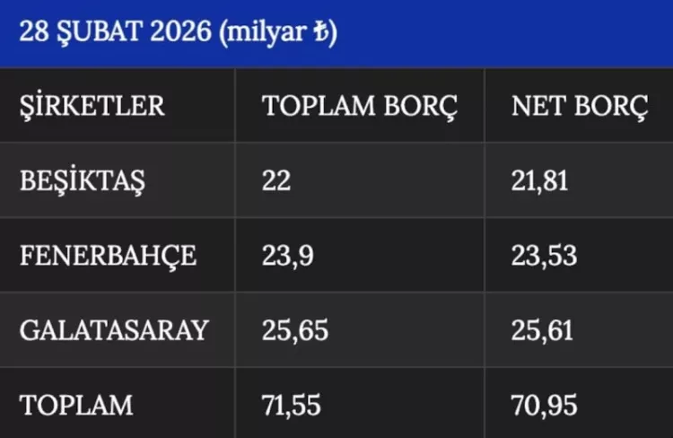 Buna göre Galatasaray’ın 25,61 milyar lira, Fenerbahçe’nin 23,53 milyar lira ve Beşiktaş’ın 21,81 milyar lira ve olmak üzere 3 kulübün toplam 70,99 milyar liralık (1,36 milyar euro) net borcu bulunuyor.