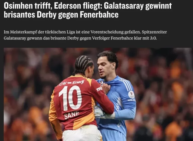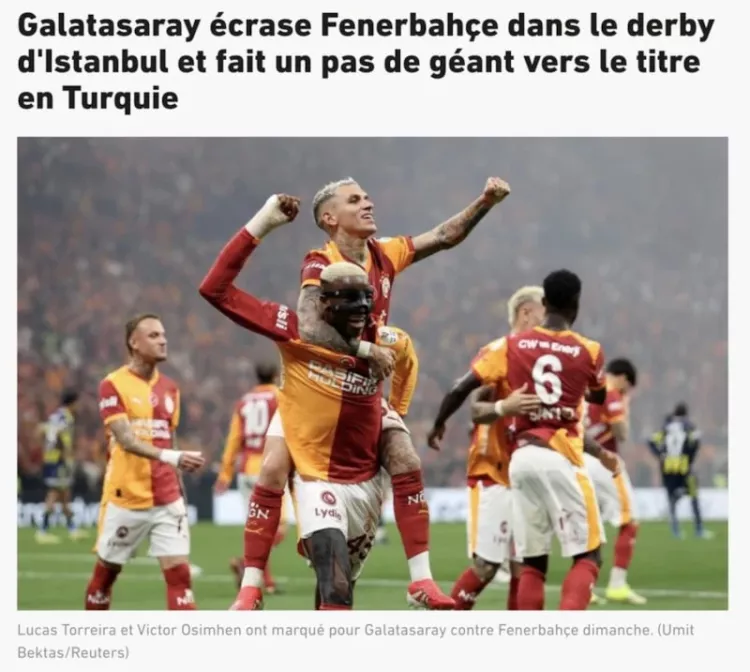 Süper Lig'in 31. haftasında Galatasaray, ezeli rakibi Fenerbahçe'yi 3-0 yenerek şampiyonluk yolunda derin bir nefes aldı. Avrupa medyası, Galatasaray-Fenerbahçe derbisine geniş yer ayırdı.