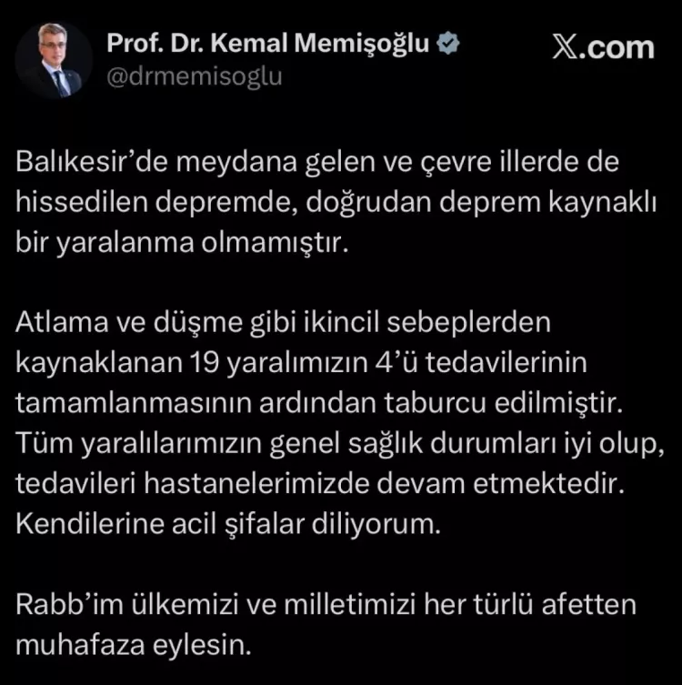 "Balıkesir’de meydana gelen ve çevre illerde de hissedilen depremde, doğrudan deprem kaynaklı bir yaralanma olmamıştır. Tüm yaralılarımızın genel sağlık durumları iyi olup, tedavileri hastanelerimizde devam etmektedir. Kendilerine acil şifalar diliyorum. Rabb’im ülkemizi ve milletimizi her türlü afetten muhafaza eylesin."