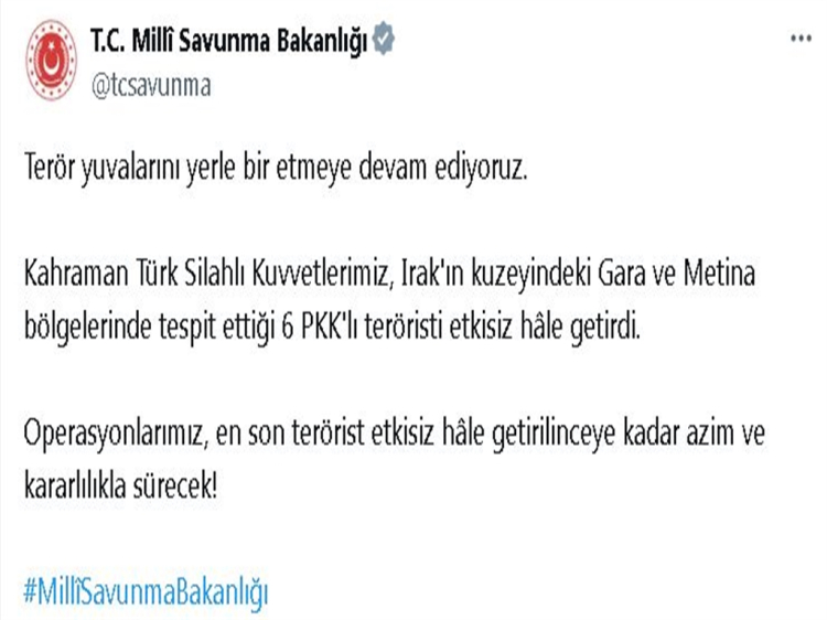 Bakanlığın sosyal medya hesabından yapılan açıklamada, "Terör yuvalarını yerle bir etmeye devam ediyoruz. Kahraman Türk Silahlı Kuvvetlerimiz, Irak'ın kuzeyindeki Gara ve Metina bölgelerinde tespit ettiği 6 PKK'lı teröristi etkisiz hale getirdi. Operasyonlarımız, en son terörist etkisiz hale getirilinceye kadar azim ve kararlılıkla sürecek" denildi