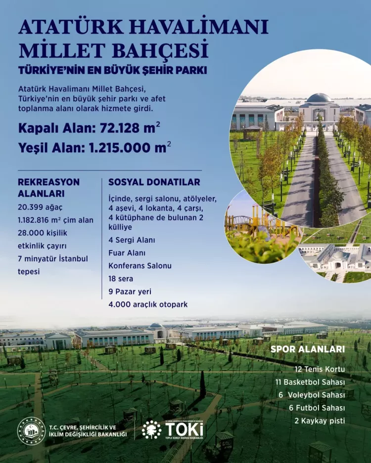 Kurum, paylaşımında, "Türkiye’nin en büyük şehir parkı Atatürk Havalimanı Millet Bahçesi, İstanbul’umuza afette sığınak, her anda nefes olacak." ifadelerini kullandı.
