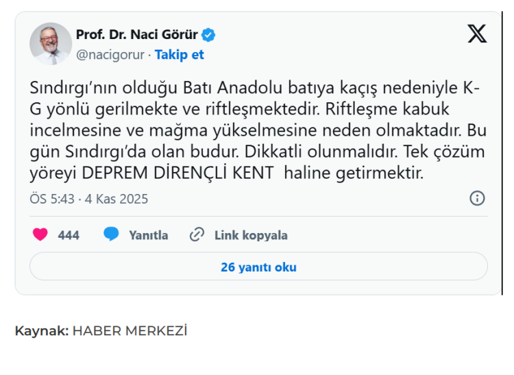 Prof. Dr. Naci Görür Sındırgı'da peş peşe gerçekleşen depremlere ilişkin yorumunu paylaştı, Sosyal medya hesabından yaptığı paylaşımda Görür şu ifadeleri kullandı: